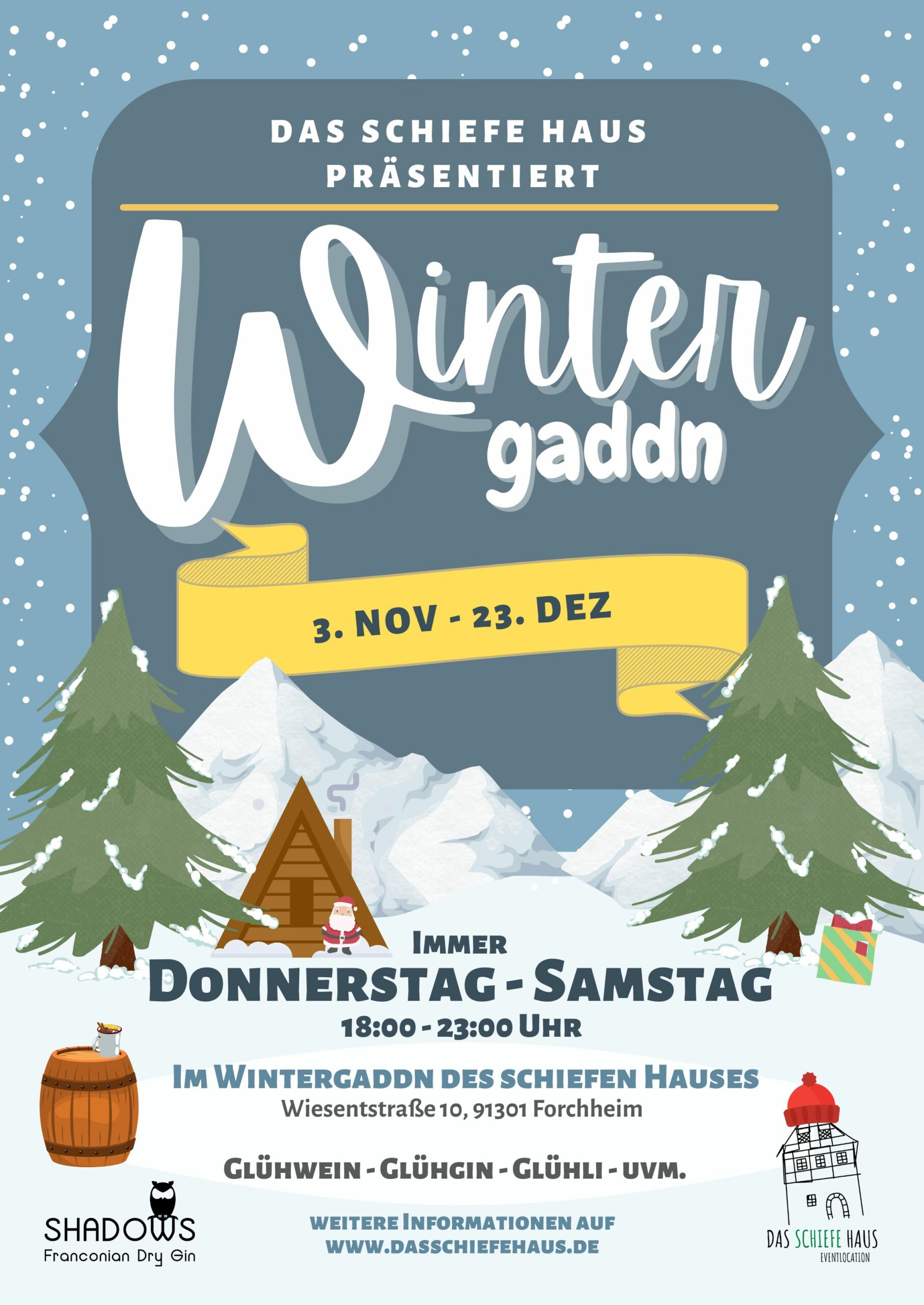 Wir, das schiefe Haus, eröffnen dieses Jahr zum erste Mal unseren „Wintergaddn“. In molliger Atmosphäre schenken wir Donnerstag-Samstag von 18 – 23 Uhr leckere Winterdrinks für Jung & Alt aus & ein.